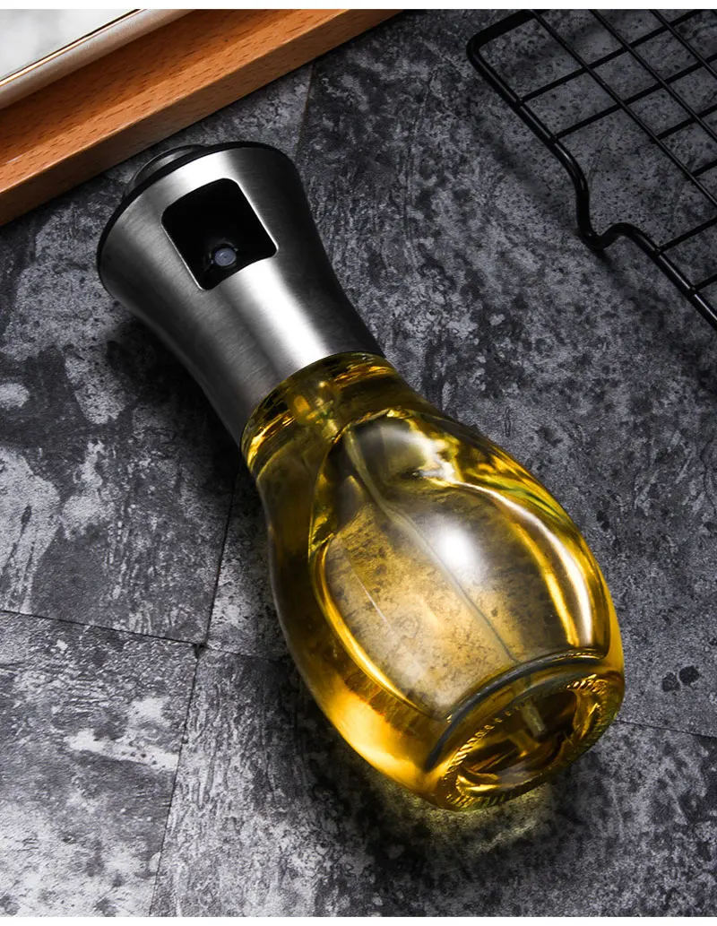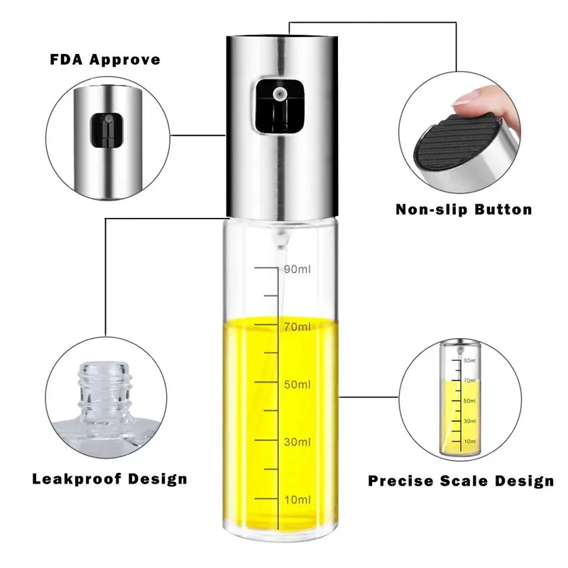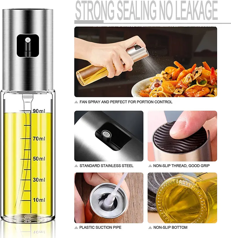 1. High quality-The cooking oil sprayer is made of 304 high-quality stainless steel and food-grade glass, which is completely BPA-free, environmentally friendly, and has a non-slip top design. It is very compact and will not slip off. It is convenient to press and control the dose by pressing the button in a large area.