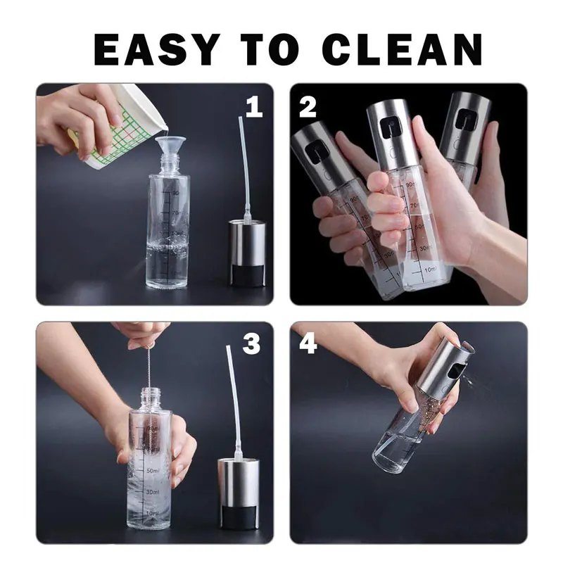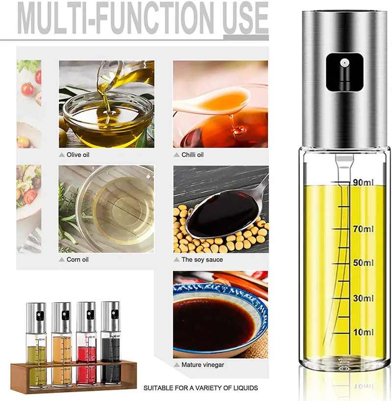 2. Multi-purpose-equipped with mini funnel and cleaning brush. This olive oil spray is the perfect tool for the home and kitchen. Fill the sprayer with your favorite sunflower oil, olive oil, vinegar, vegetable oil, lemon and lime juice, sauce, sherry or wine, etc. And widely used in salad making, cooking, baking, frying.