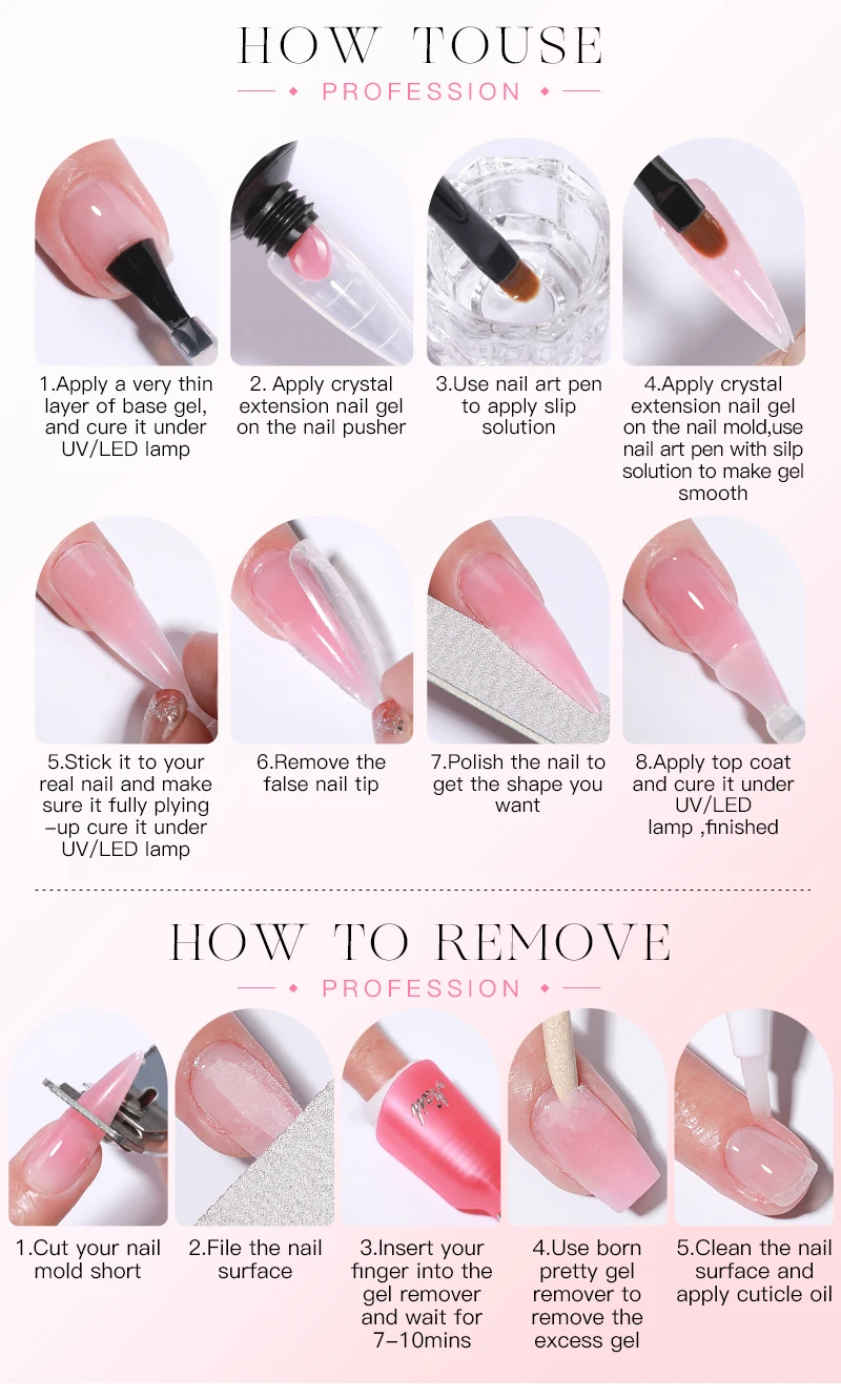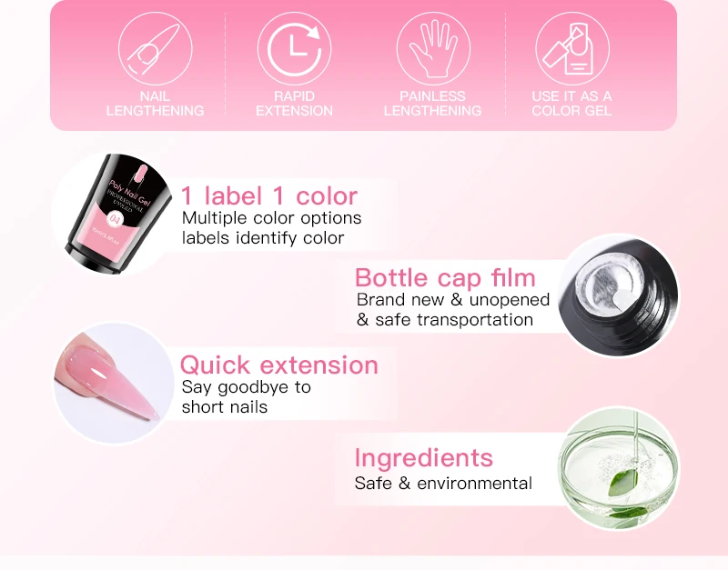 What is a poly Quick gel nail set? We specialize in poly Quick gel nail kit, one-stop shopping, saving you the time of choosing other odds and ends. The selection of all poly Quick gel colors is inspired by the current popular color aesthetics, which is in line with your four seasons and different occasions. How long do Poly Quick gel nails last? 35-40 days High Quality & Long Lasting:The formula has been tested and adjusted many times. Poly Quick gel is non-toxic, safe in ingredients, easy to dry, and has good toughness. It can be kept for a month or even longer after manicure on the fingers.
